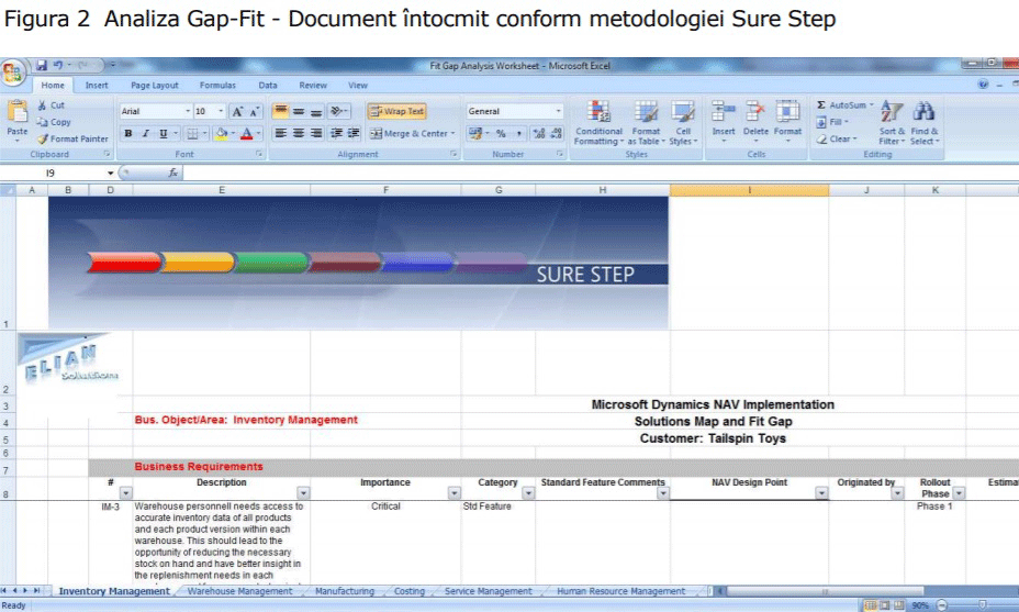 The Gap-Fit analysis document is usually produced in Excel and is structured by functional areas (Financial, Procurement, Sales, Production, etc.) The role of this document is to clearly qualify the functional requirements that are solved by the standard system versus those that require developments in the system.