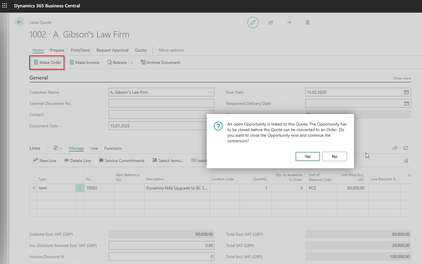If the quote is accepted, it can then be converted into a “Sales Order”. When the order is generated from the quote, the opportunity can be closed.